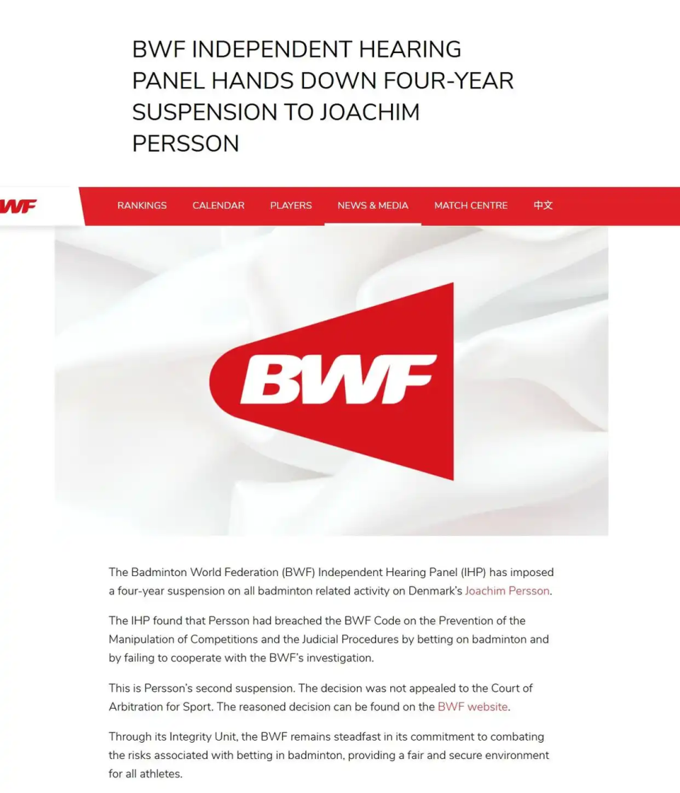 这并非佩尔森首次陷入诚信危机。此前,他就因涉及4 项与投注、赌博及比赛结果异常相关的违规行为,被世界羽联处以18个月禁赛,同时罚款4500美元。